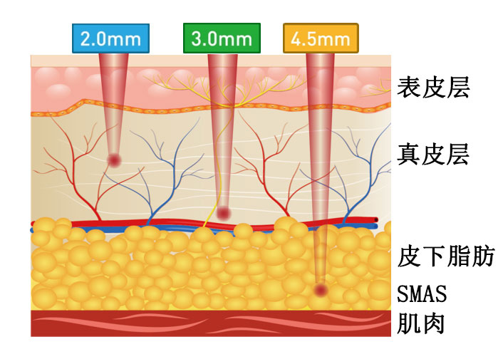 「Uliftra优芙纳音波」是高能量聚焦超音波技术原理,在不伤害皮肤表面的前提下,直达真皮层和SMAS筋膜层聚焦点状汇集能量,各点温度可达65度以上,精准传递热能只治疗部位,组织热效应会使SMAS筋膜层收缩,